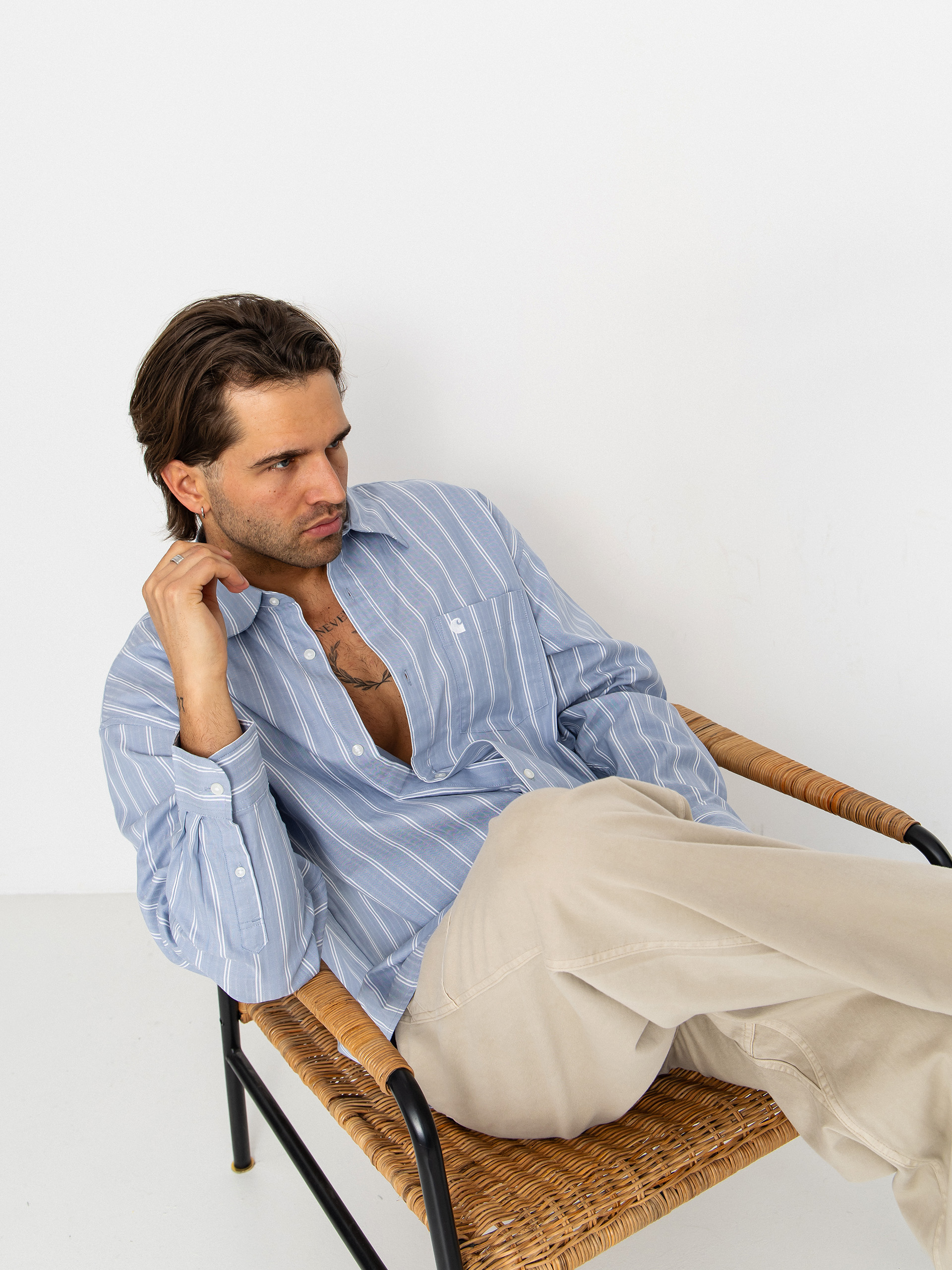 • Carhartt WIP Beale je lehký, vzdušný kousek volného střihu, který je ideální pro každodenní pracovní oblečení a streetwear styling. Je vyroben z dobby bavlněné tkaniny s na dotek příjemnou texturou a má jemný pruhovaný vzor, který mu dodává charakter a kvalitní řemeslné zpracování. Volný střih poskytuje volnost pohybu a pohodlí, zatímco díky klasickému límci a dlouhému rukávu se košile hodí k ležérním i rafinovanějším outfitům. Na hrudi se nachází kapsa s vyšitým logem „C”, kteréójsou minimalistickým, rozpoznatelným akcentem značky Carhartt WIP.