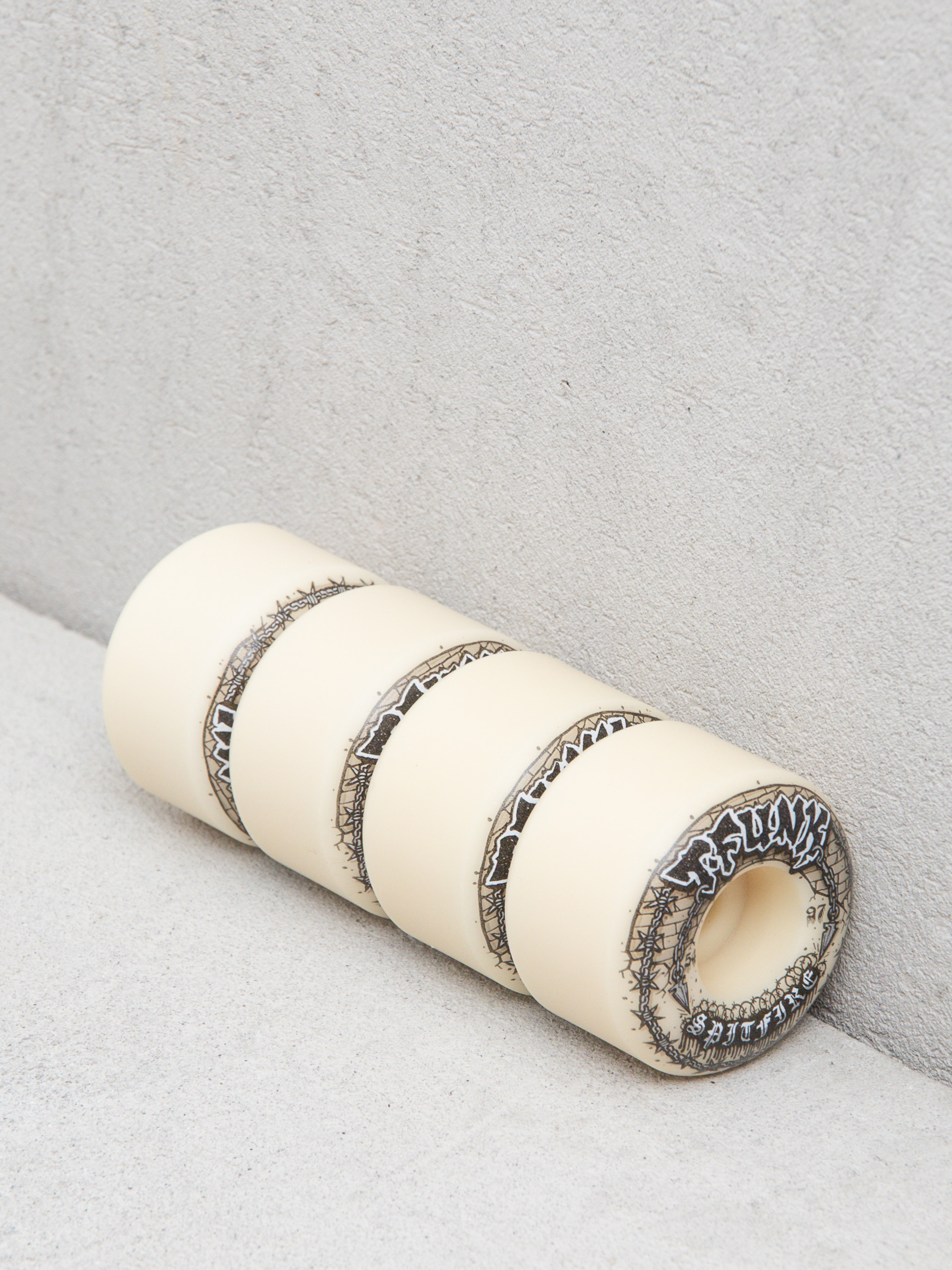 • Spitfire F4 97D T-Funk Raw Radial Full je profesionální kółka Tristana Funkhousera, vytvořená pro rychlou a stabilní jízdu s větším odpružením než tvrdší verze 99D. Vzorek Four 97D poskytuje vysokou odolnost proti oděru, žádné flatspotyóa hladký valivý pocit, zatímco široký profil Radial Full zajišťuje kontrolu a stabilitu v každém terénu.